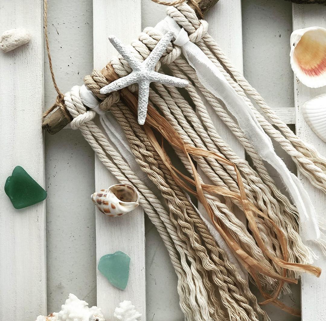 マクラメロープや裂き布を利用したミニタペストリー。様々な貝やシーグラスをお好きにデコレーションしてください。