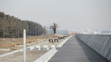 震災で動いてしまった墓地公園の東京湾側の防潮堤ですが、全てを壊した後に新しい防潮堤が完成しました。