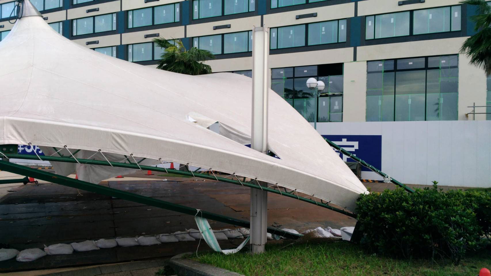 2017年9月18日未明に浦安を襲った大型の台風18号により、浦安フェスティバルでねぶたの組み立てに使ったテントが倒れて壊れてしまいました。テントは周辺の照明用の柱に突き刺さってしまいました。