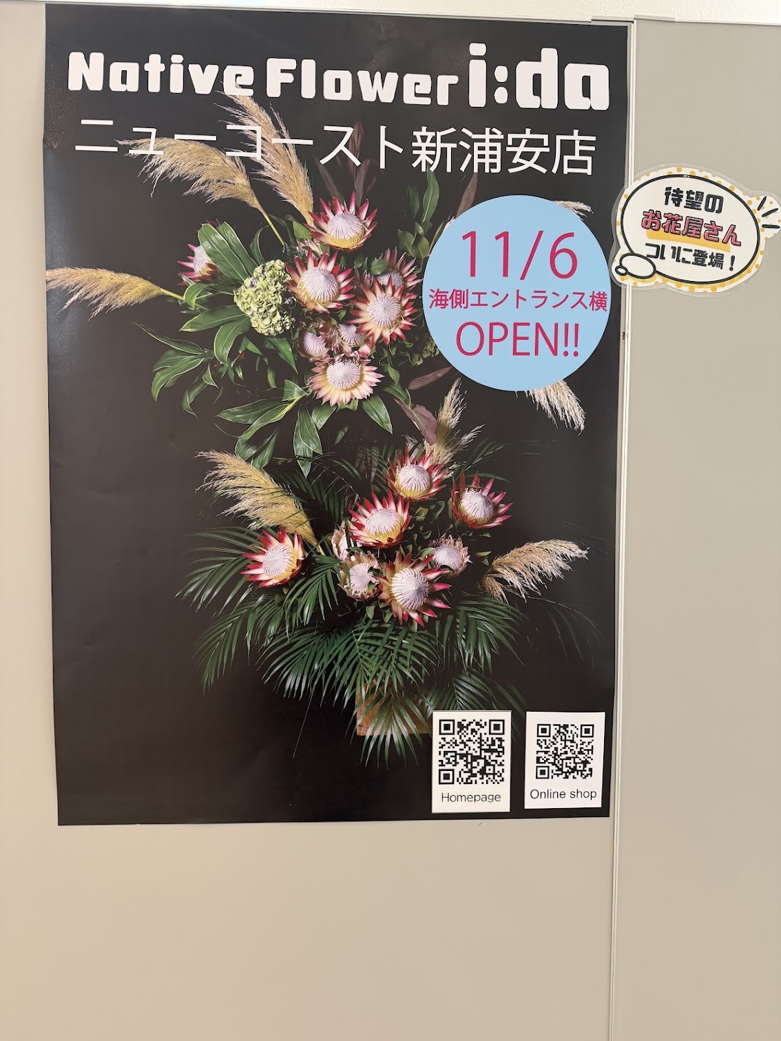 2025年11月6日にニューコースト新浦安1階のセブンイレブン側入り口横に花屋「Nativeflower i:da」がオープンします。