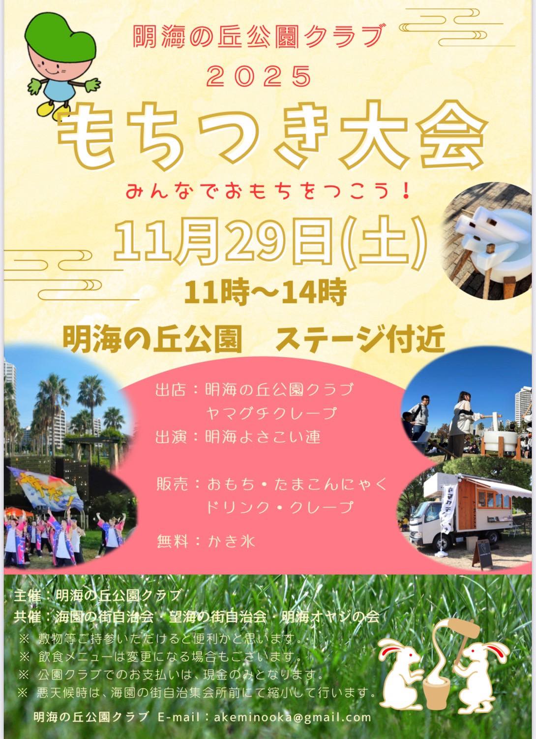 2025年11月29日に明海の丘公園にて、「餅つき大会」が開催されます。