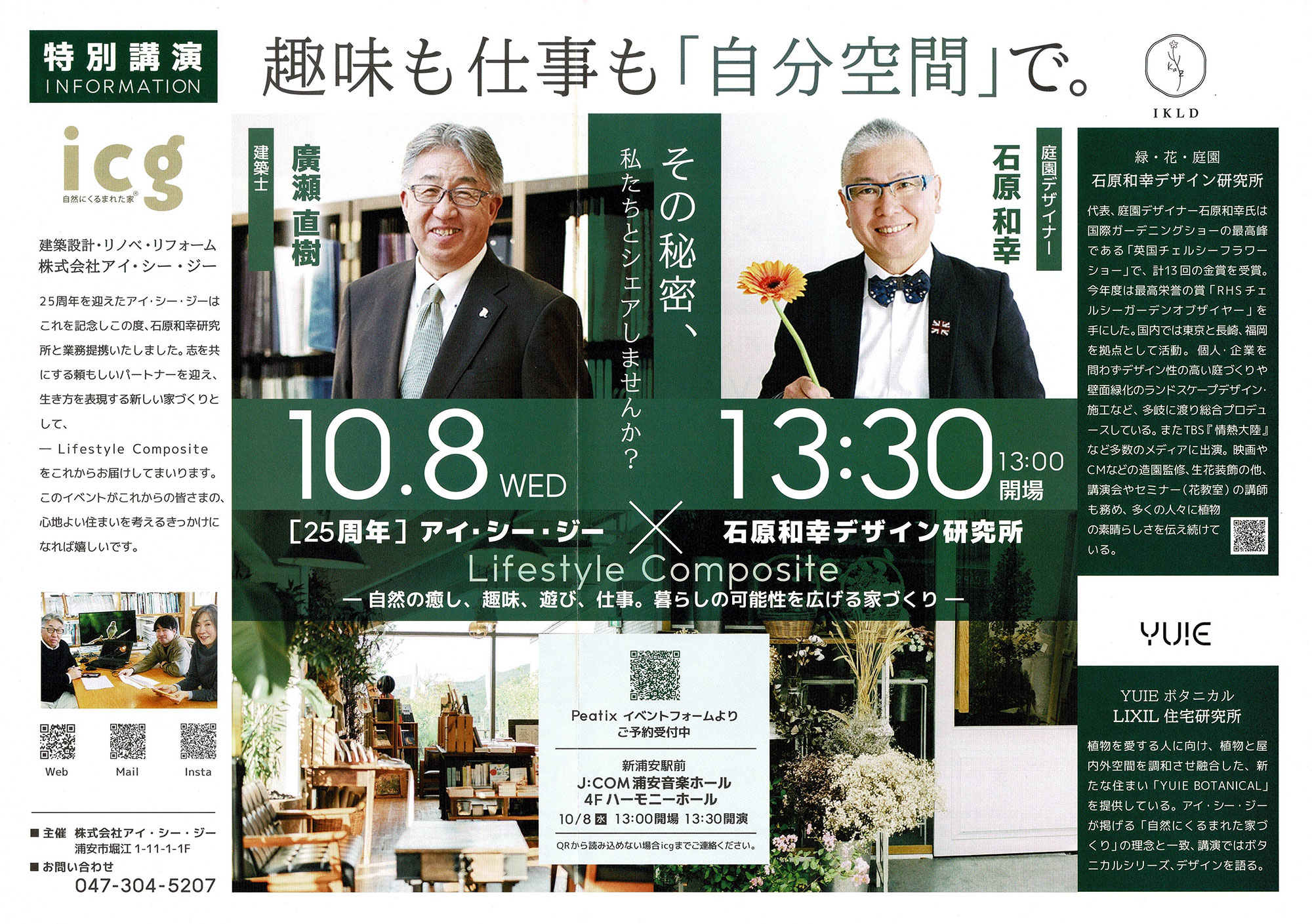 京葉エリア・東京23区を中心にデザイン住宅やリフォーム・リノベーションを数多く手掛けてきた、市内の設計建築会社アイ・シー・ジーが、25周年を記念し石原和幸デザイン研究所と業務提携。国際ガーデンショーの最高峰「チェルシーフラワーショー」で17年連続受賞・ゴールドメダル13冠という実績を誇る庭園デザイナー 石原和幸氏 を迎え、自然の癒し、趣味、遊び、仕事。暮らしの可能性を広げる家づくり 「ライフスタイル コンポジット」について、愉しいトークを交えたイベントが開催されます。