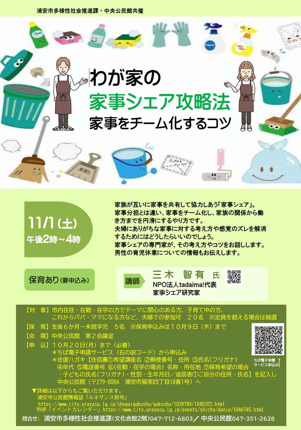 14:00〜16:00 浦安市多様性社会推進課・中央公民館共催事業 「わが家の家事シェア攻略法〜家事をチーム化するコツ」